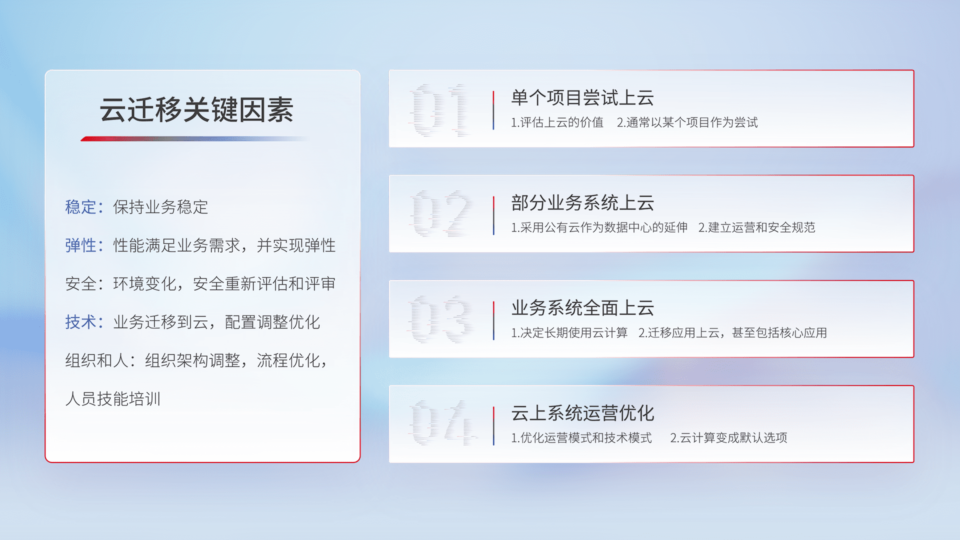 结合实际业务,,,从规划设计、、云平台选型、、、、云原生改造、、、、数据迁移、、、集成交付,,,迁移全过程为客户识别最佳上云路径,,做好风险识别管理,,设计网络架构、、、、身份权限、、安全审计合规、、、、操作审计、、日志审计、、、、监控告警策略、、多站点容灾设计等,,,,对云上基础设施进行整体规划,,,,提升IT治理水平,,,以满足弹性、、高可用、、、高性能的需求。。。